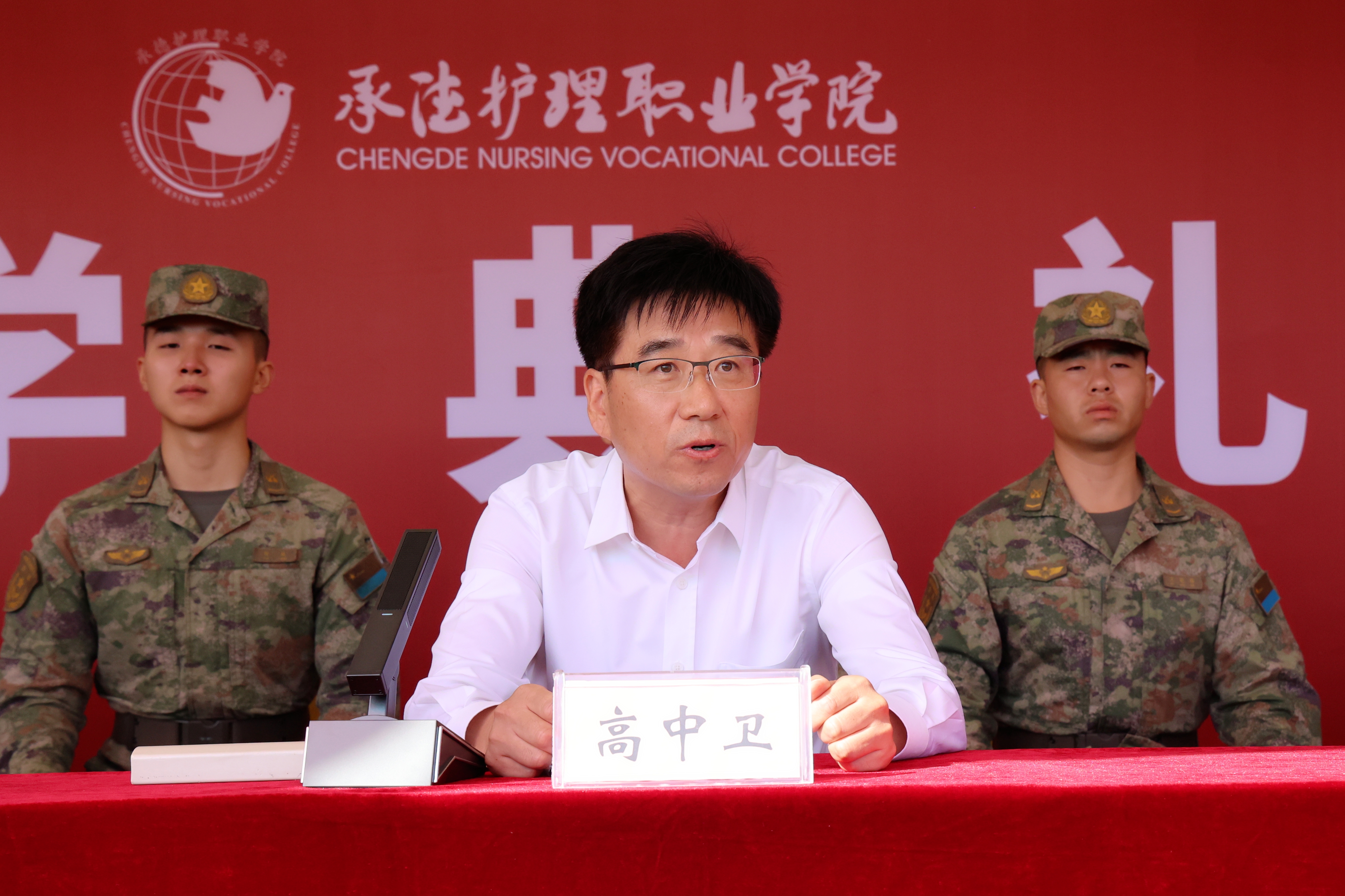 典礼上,高中卫讲话并为2023级全体新生讲授“开学第一课”,深情寄语同学们,要坚定信仰,报效祖国。要坚定马克思主义的信仰,坚定新时代中国特色社会主义的信念,坚定中华民族伟大复兴中国梦的信心。把爱国、爱党、爱社会主义高度统一起来,听党话、跟党走,胸怀忧国忧民之心、爱国爱民之情,不断奉献祖国、奉献人民;要砥砺躬行,发愤图强。要热爱所学专业,学一技之长,求真学问,学真本领,谨记健康所系、性命相托,常怀敬畏之心,把专业学习和前沿知识有机结合,把课堂知识与社会实践相融通,奋力成为论扎实、技术过硬的合格医疗卫生专业人才;要立德修身,知行合一。做到以德润身,慎独慎微,勤为善小,常怀感恩之心,在今后的学习生活中,既要从小处着手,不断设定学习深造的阶段性目标,更要从大处着眼,把小我融入大我,主动投身时代洪流,心怀天下,主动把个人学习、事业发展与国家、民族、人类命运紧密联系,笃行不怠,奋力书就不负美好青春,不负“强国有我”的铮铮誓言。同时,希望同学们在军训中认真领会军训的目的和意义,迎接军事训练的锻炼和考验。虚心向军训教官请教和学习,继承和发扬人民军队优良传统。严格遵守军训纪律和注意安全,高标准完成军事训练任务。