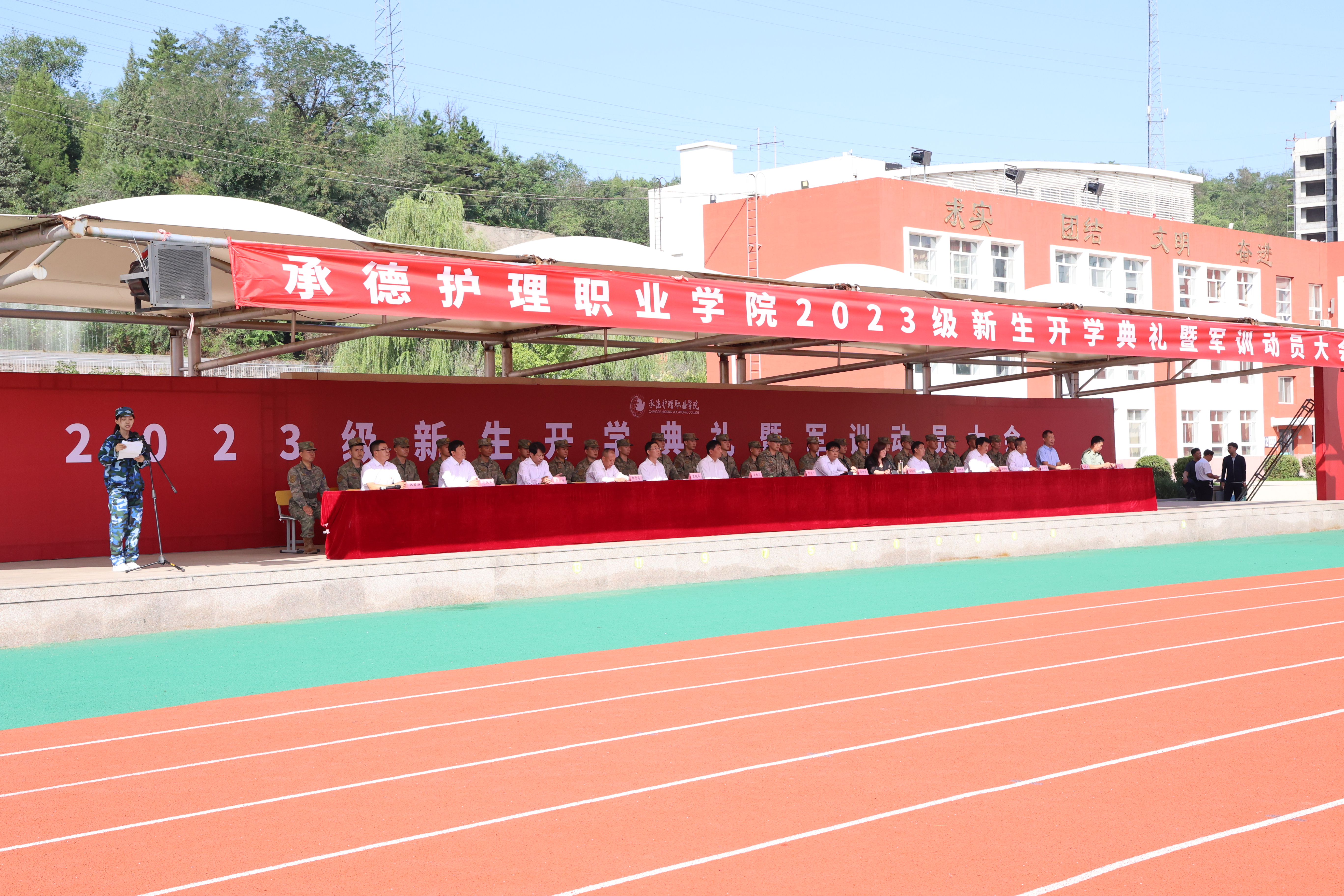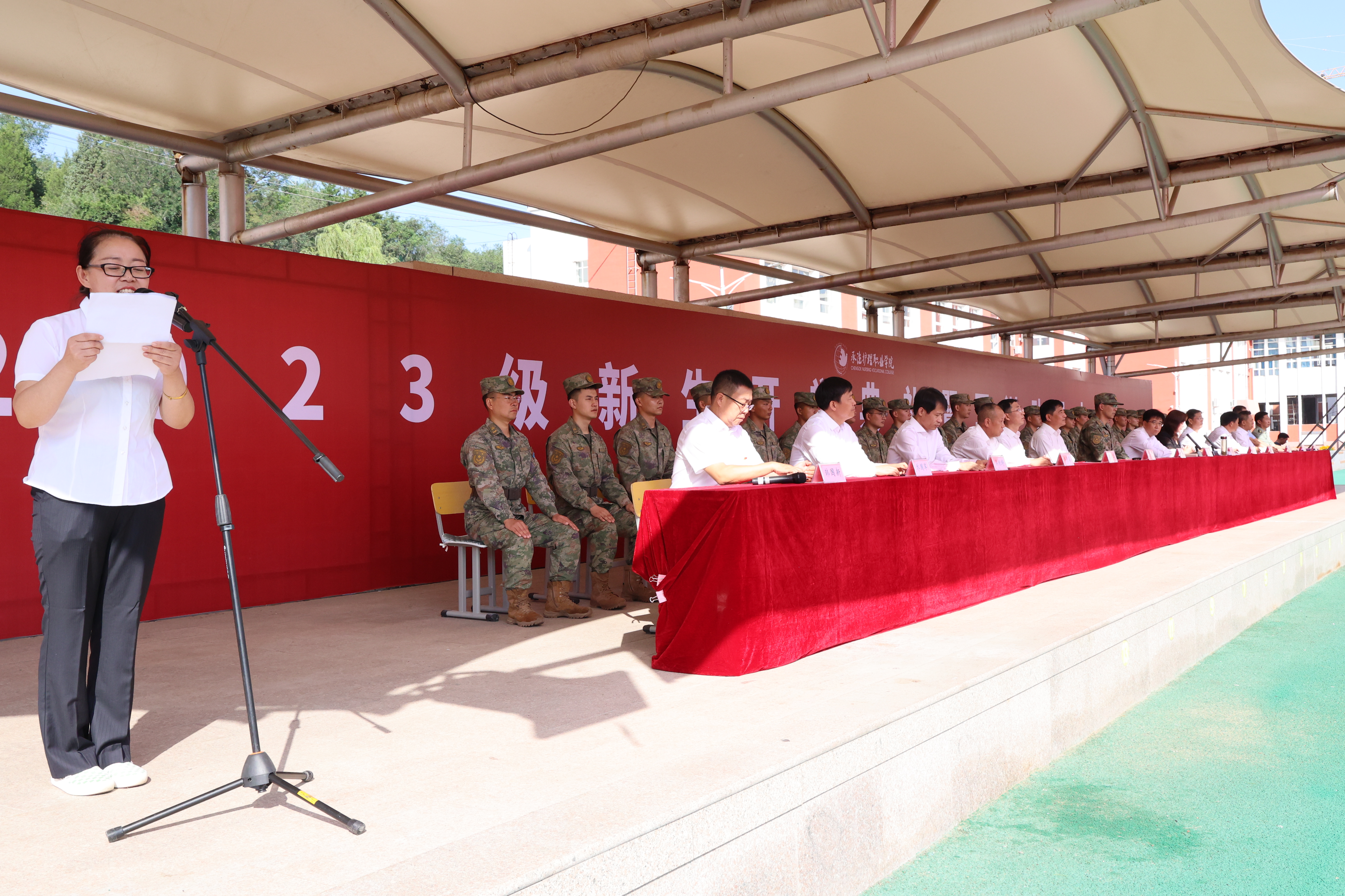 9月11日,学校举行2023级新生开学典礼暨军训动员大会,党委书记高中卫、校长单伟颖及其他党委班子成员出席典礼,安全工作处(武装部)、学生工作部主要负责人、93575部队参训教官、2023级全体新同学以及辅导员参加典礼。单伟颖主持典礼。