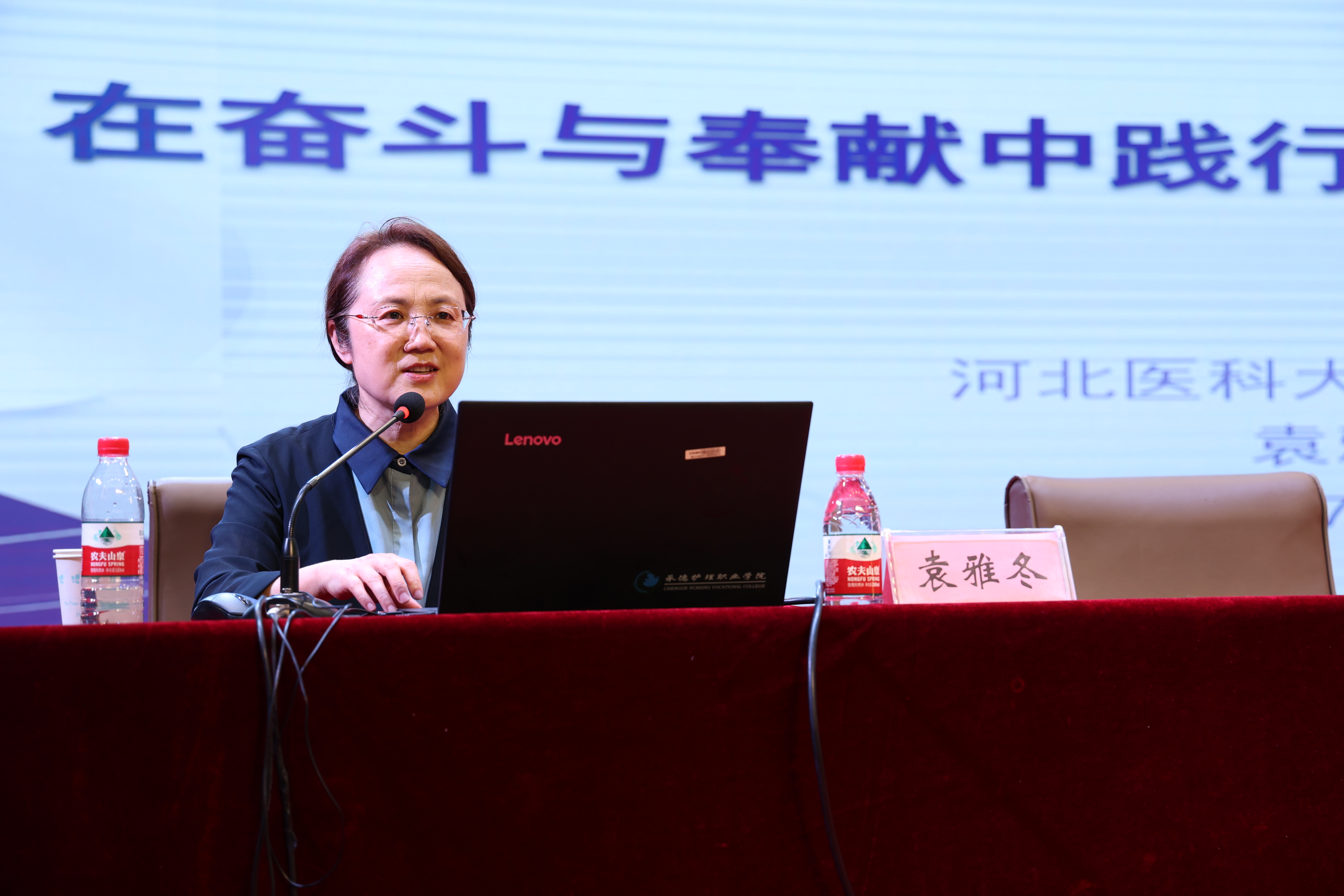 袁雅冬以“在奋斗与奉献中践行科学家精神”为主题进行宣讲,她围绕带领河北省医疗队驰援武汉、积极投身河北石家庄邢台等地抗疫、作为一名临床医生认真做好本职工作、作为一名科研工作者如何严肃认真完成科研工作及作为一名教师如何教书育人等亲身经历和事例生动地诠释了中国科学家精神。在场的师生深受感动,纷纷表示要以袁雅冬教授为榜样,身怀爱国之心、砥砺爱国之志,发扬新时代中国科学家精神,学好本领、增长才干,扎扎实实地做好本职工作,争当科学家精神的继承者和践行者。