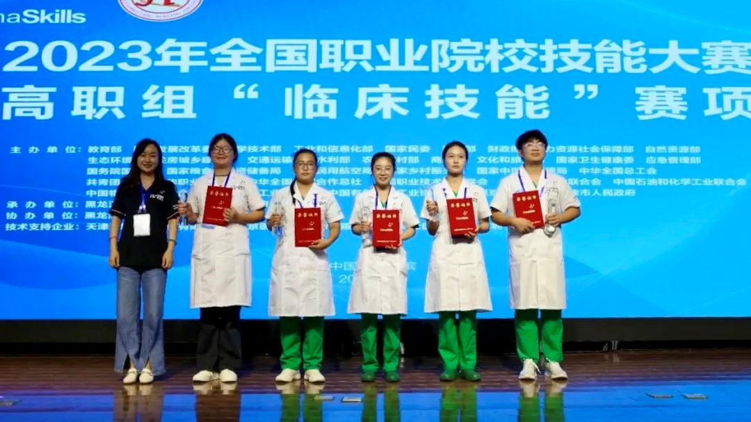 临床技能赛项学生组一等奖颁奖合影(左三为祖梦欣)