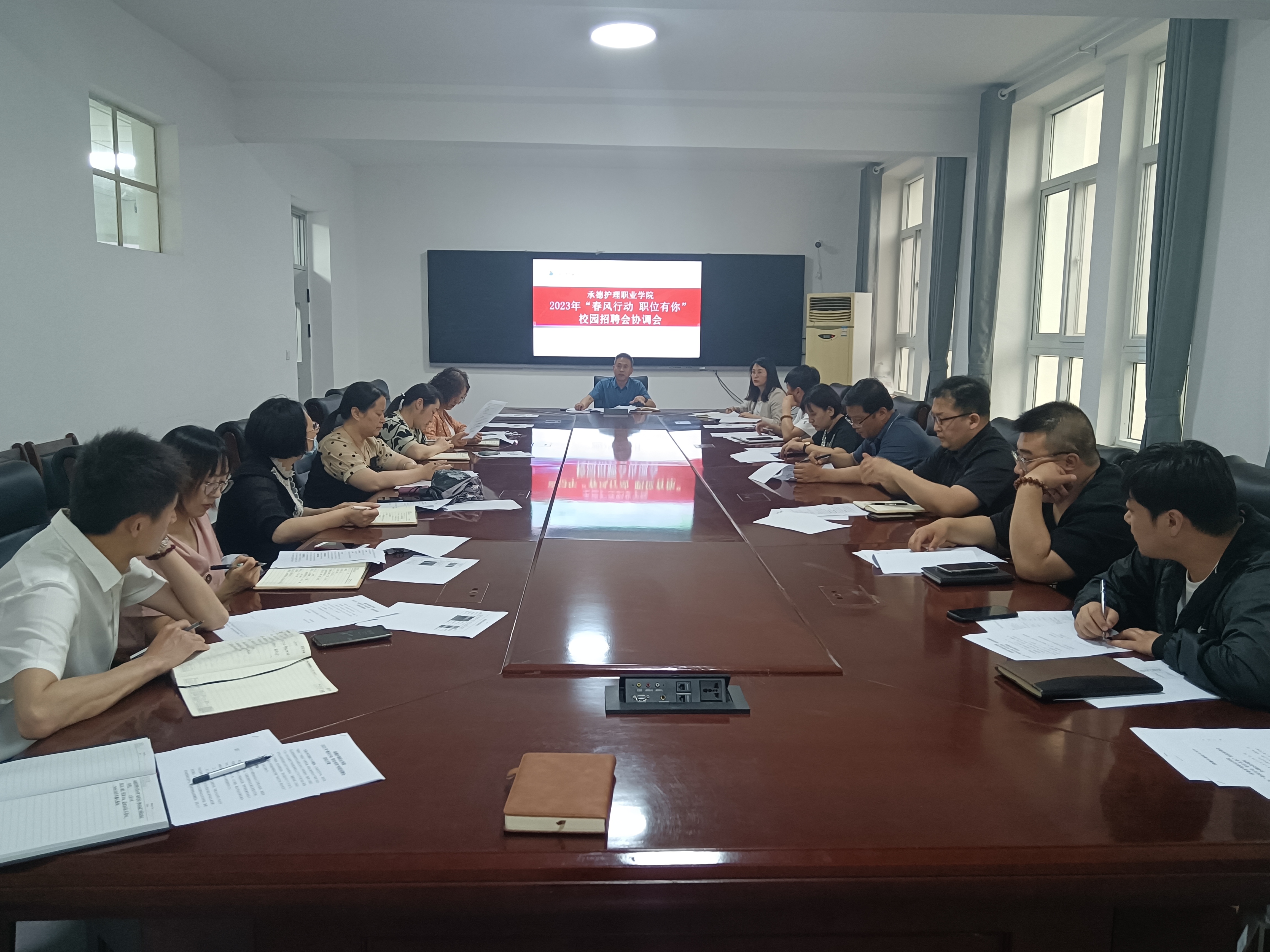 为落实教育部普通高校毕业生就业工作会议精神,大力推进学校就业创业工作,为毕业生提供更多优质工作岗位,5月16日上午,在5号教学楼2楼会议室组织召开2023年就业推进会暨2023年“春风行动 职位有你”校园招聘协调会。副校长白兴武出席并主持会议。党政办公室、宣传部、后勤处、招生就业处、网络安全与信息化中心、学生工作部(团委)、各系部负责人参加了会议。
