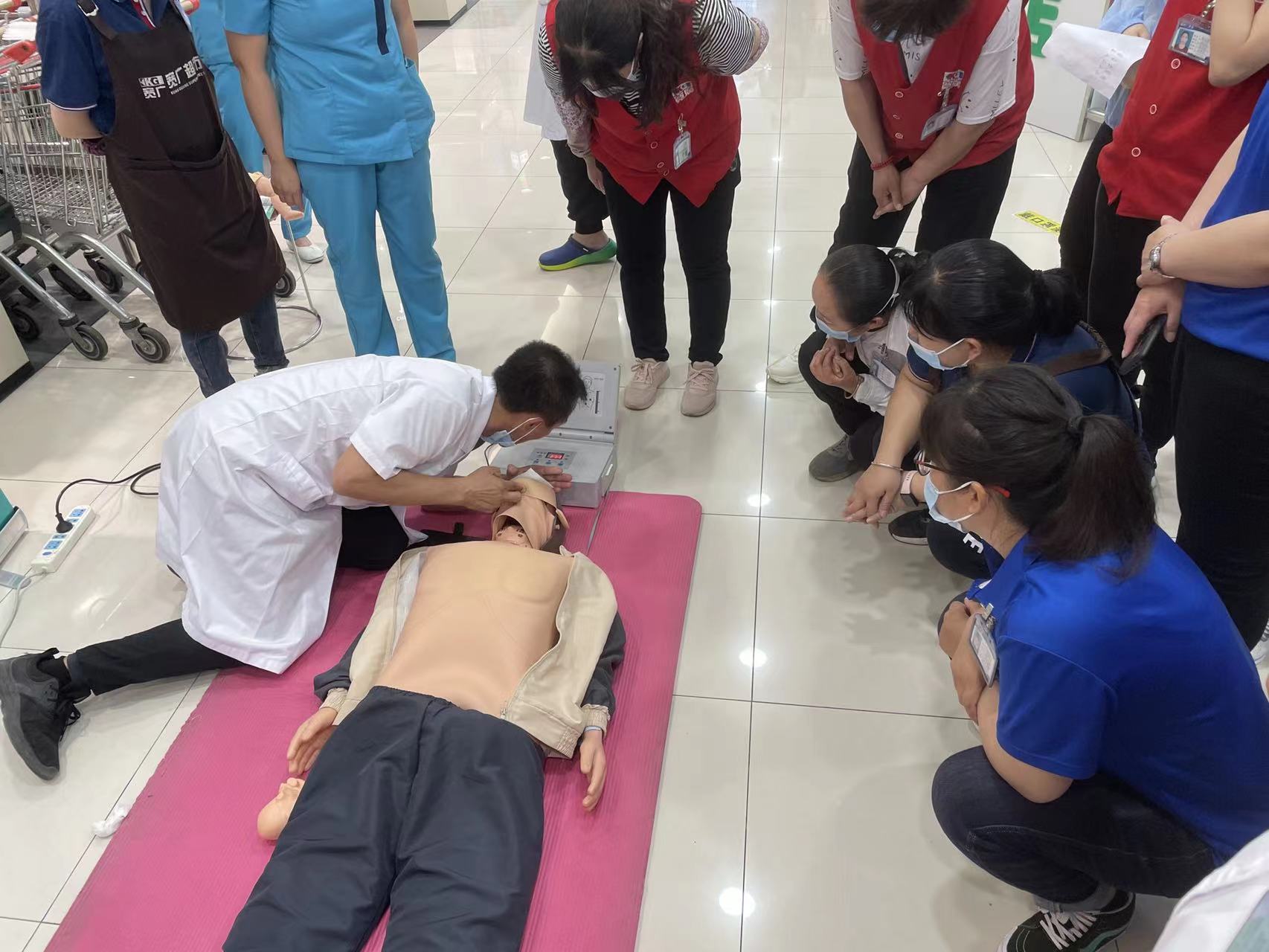超市活动空间紧凑,人流量大,突发疾病等意外事件的发生率相对较高,为了能够及时施救、减轻减少伤害,志愿服务队对超市员工和往来群众进行急救技能培训,行政支部的党员志愿者向大家发放急救知识宣传单,外科教研室的教师志愿者通过现场讲解和医用人体模型的演示和实操,超市员工和往来人群学习掌握了心肺复苏、海姆立克急救、包扎止血等急救处置方法,纷纷表示这样的现场操作式的培训非常有意义,紧急情况发生的时候进行自救互救可能就会为下一步的专业救治赢得宝贵时间、挽救生命。