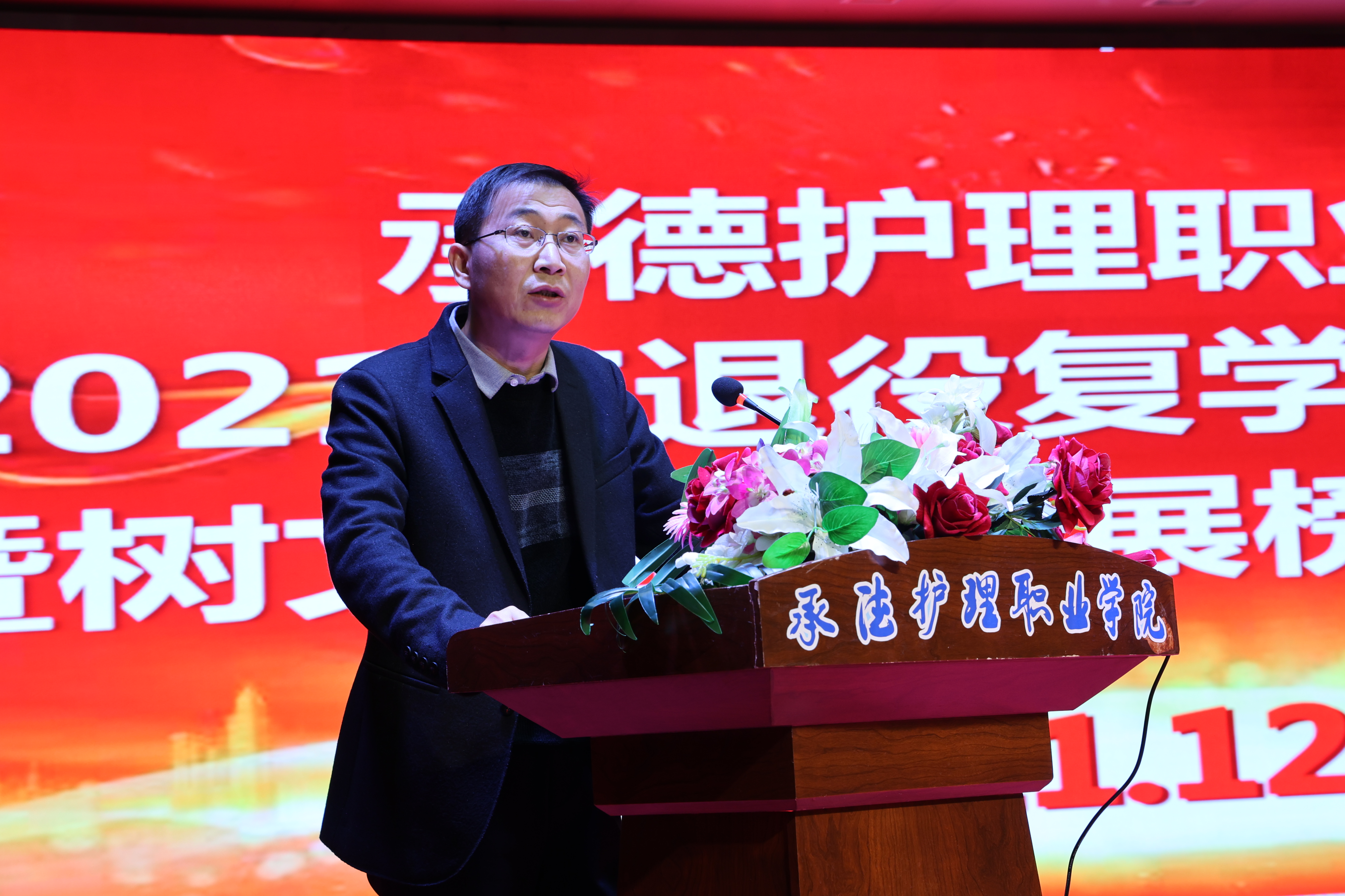 在校生雒亚东同学代表全体学生发言,他表示,要向退役复学学生学习,学习他们崇军尚武的英雄气概,学习他们从军报国的家国情怀,学习他们勇于挑战的大无畏精神,努力提高自身素质,争做学生楷模,努力成为德、智、体、美、劳全面发展的新时代大学生。