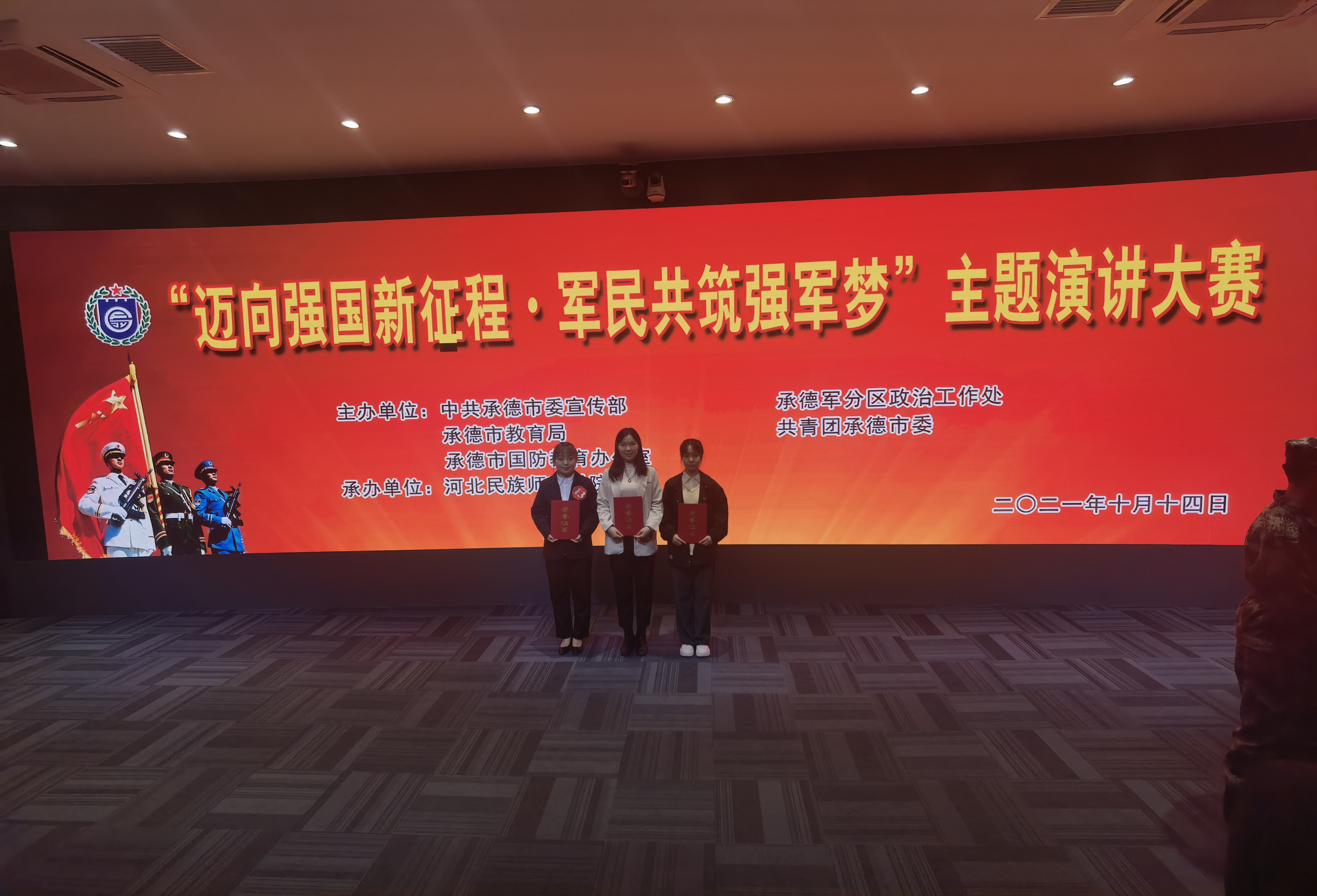 为普及国防知识、厚植家国情怀,激发莘莘学子赓续红色血脉、崇尚英雄、矢志报国的热情。10月14日,中共承德市委宣传部、承德市教育局、承德国防教育办公室、承德军分区政治工作处、共青团承德市委联合举办的“迈向强国新征程,军民共筑强军梦”主题演讲比赛在河北民族师范学院举行。