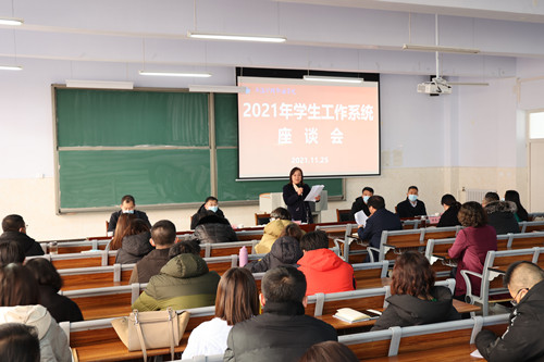 11月25日下午,2021年学生工作系统座谈会在体育馆第九公共教室召开,学校党委副书记、院长单伟颖出席并主持会议,副院长徐国辉、崔艳华、白兴武出席会议,党政办公室、学生处、团委、实习就业处主要负责人、各系党总支副书记、全体专兼职辅导员及系部学工干事参加了座谈会。