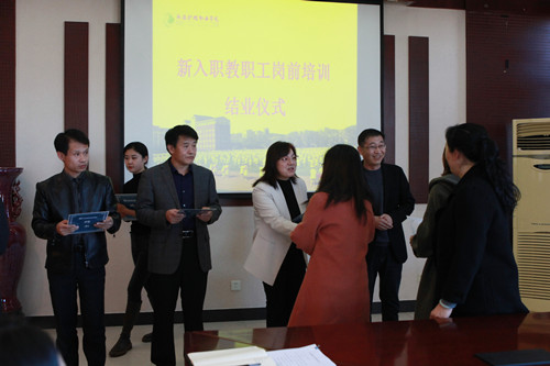 结业仪式上,单伟颖、崔艳华、徐国辉、吴振琦为新入职教师(辅导员)的带教老师颁发了导师聘书。