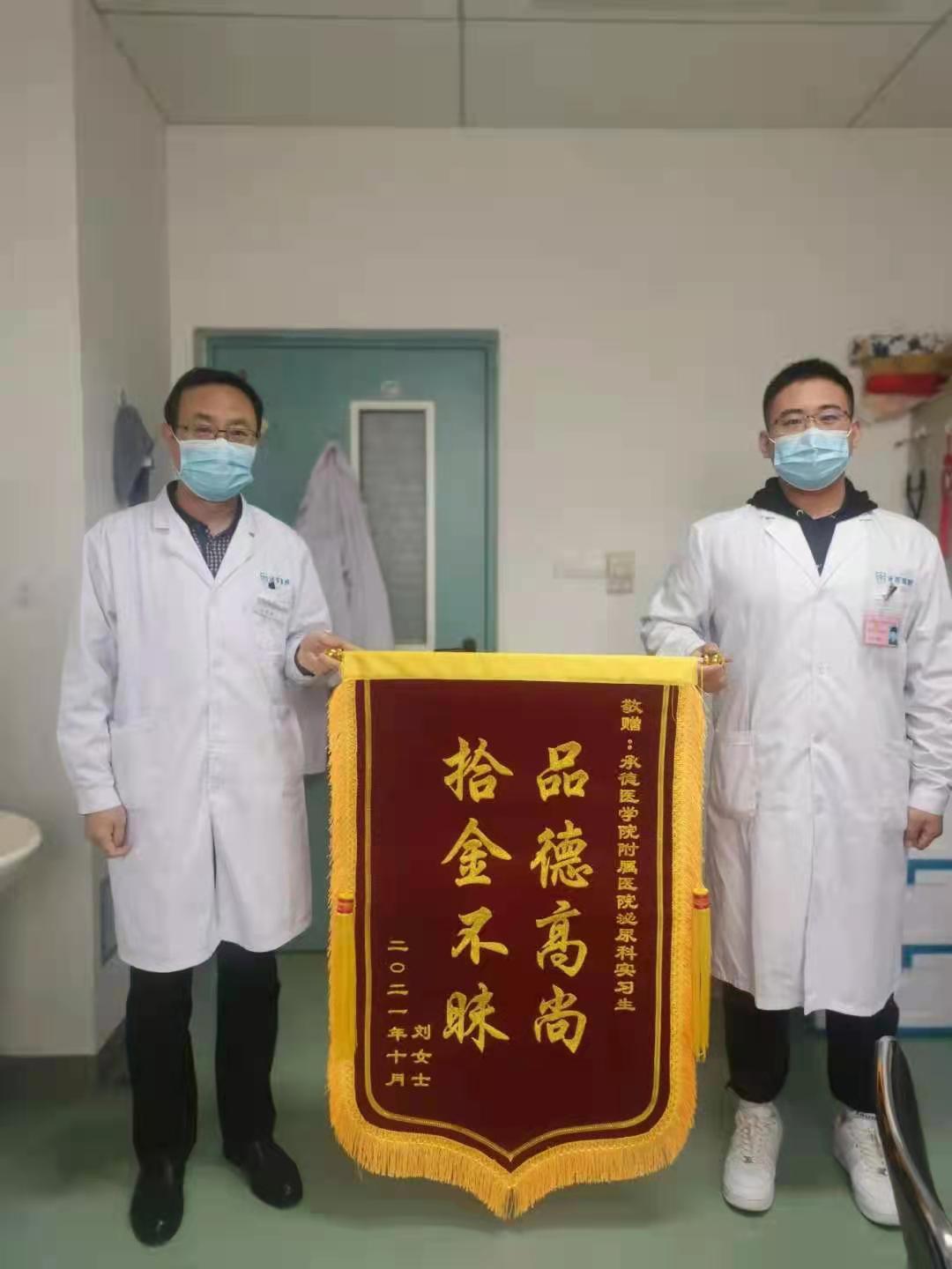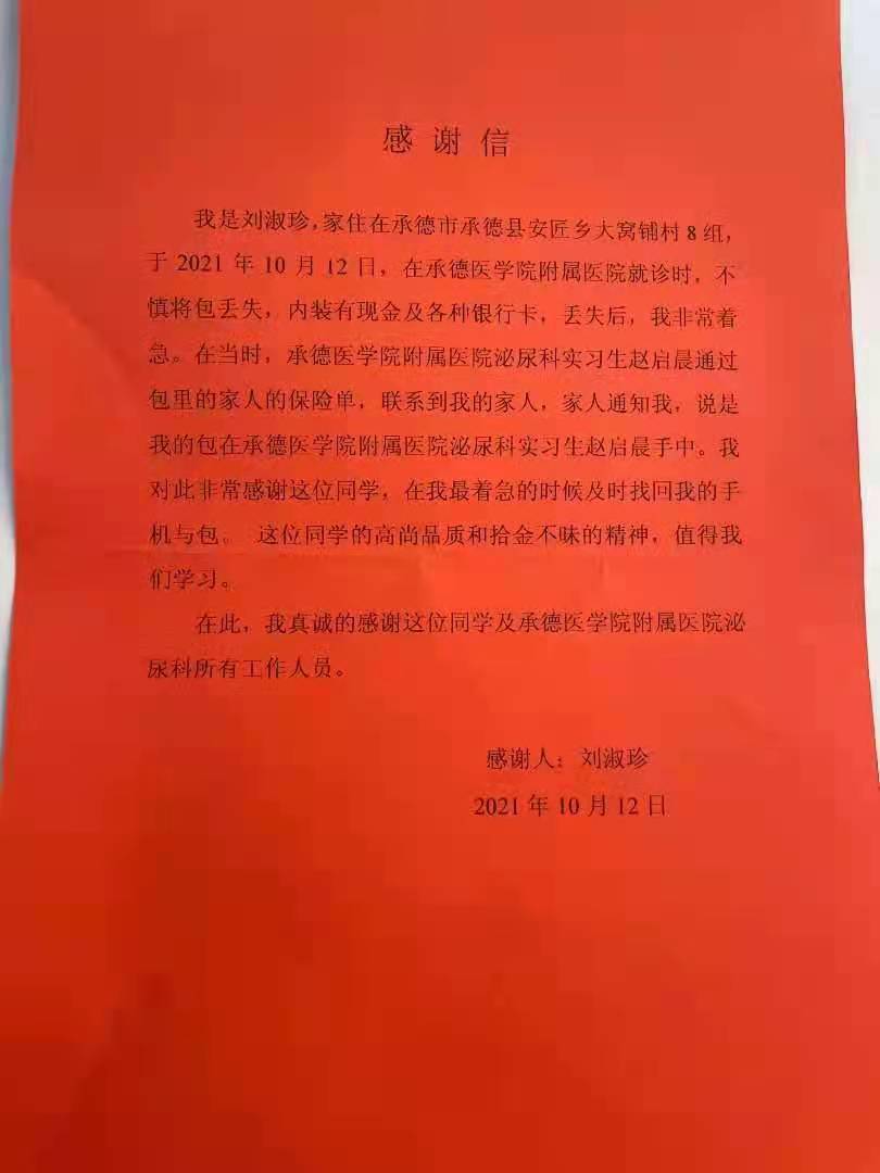 赵启晨,医学系2019级临床医学二班学生,目前正在承德医学院附属医院实习。10月12日中午下班后,在医院一楼厕所旁边的椅子上拾得一个手提包,经询问周围人无果,他就在原地等候失主。过了一会,仍无人认领,他便检查包里是否有失主信息,发现包里有多张银行卡、身份证、票据,还有大量现金。当发现一张保险单上有失主联系电话时,赵启晨立即拨打对方电话,并告知了具体地点。失主见到手提包十分高兴,当即拿出1000元现金表示感谢,赵启晨急忙表示这是自己应该做的,果断拒绝了失主的酬谢。失主十分感动,随后向赵启晨和医院送来一封感谢信。