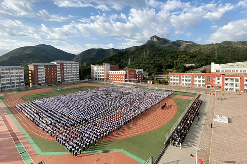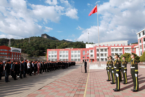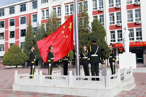 党委成员、全校师生佩戴国庆特制口罩,统一着装,整齐列队。由退役大学生组成的“学校国旗护卫队”迈着铿锵有力的步伐,走上升旗台基座,升旗手奋力挥动右臂,将鲜艳的五星红旗抛向天空,伴随着高亢的《义勇军进行曲》,鲜艳的五星红旗冉冉升起,全体师生面向国旗肃立行注目礼,高唱国歌,为伟大的祖国献上诚挚祝福,共同祝愿祖国繁荣昌盛,祝愿家乡美丽富饶,祝愿学校发展蒸蒸日上。