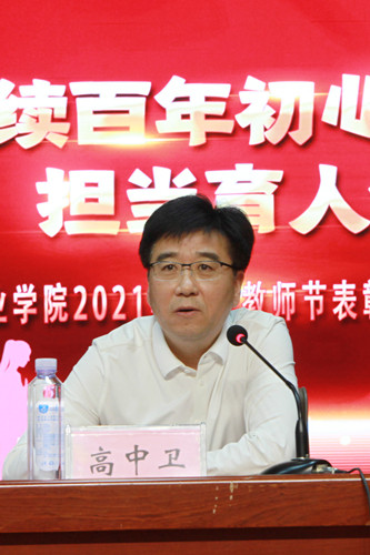 高中卫发表讲话,他代表学校向奋斗在教学、科研、管理、服务、扶贫第一线的全体教职员工致以节日的祝贺和崇高的敬意!向关心学院发展、为学院建设做出贡献的离退休老教师表示诚挚的感谢和亲切的问候!向受到表彰的先进集体和个人表示热烈的祝贺。他表示,在过去的时间里,学校广大教师立足岗位,辛勤耕耘、无私奉献,心血育桃李、粉笔写春秋,培养出大批的医疗卫生技术人才,为学校的发展做出了卓越贡献。学校将深入学习习近平总书记在承德考察的重要讲话精神和职业教育大会重要讲话精神,推进职业教育教学改革,积极为教师谋福祉、为教学办公环境呈现新面貌而努力,创造更好的教书育人、科学研究、学生生活条件。在十四五规划开局之年的重要时间节点,为实现学院未来五年的发展目标,高中卫书记对全院教师提出了四点要求:一是坚持政治原则,坚定理想信念。在工作之中一定要保持政治清醒和政治定力,增强政治敏锐性和政治鉴别力,只有教师有信仰,学校有坚守,学生才有未来。二是做到胸怀学校,以学校为家。全身心都投入到教育教学工作当中,坚持立德树人,为学校的特色发展贡献自己最大的力量。三是不断精通业务,提高自身素质。要树立持续学习意识,更新知识、技能储备,争做学术功底扎实、创新能力强的好教师。四是心系学生,严肃认真对待自己的职责,帮助学生筑梦、追梦、圆梦,让一代又一代青年学生在威尼斯娱人城集团成长成才。