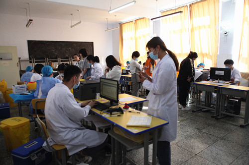 在双桥区卫健委的指导下,后勤处统一协调组织,疫苗接种区设在二号教学楼和一号教学楼一楼教室。按照疫苗接种场所设置要求,合理布置等候区、签字确认区、登记区、接种区、留观区,并设置急救室。入口、安全通道、一米线、场地标志、志愿服务等多方面精心设置科学安排。做到“分区明确、标识明显、路线顺畅、组织有序”。市中医院医护人员组织实施接种。