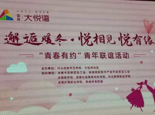 本次活动以“邂逅暖冬·悦相见·悦有缘”为主题,由河北民族师范学院和大悦湾项目主办,承德市双桥区总工会、承德高新技术产业开发区总工会、承德医学院、承德石油高等专科学校、河北旅游职业学院、承德护理业学院和承德单身联盟协办。活动现场,气氛轻松愉快,通过自我介绍、互动游戏、才艺表演等环节,大家拉近了距离、加深了印象、增进了友谊,活动结束后又建立了微信群进行深度交流。