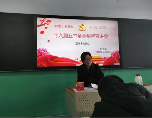 11月30日,学院党委委员、副院长宫林利在五号教学楼67教室为护理系全体教师作了学习贯彻党的十九届五中全会精神宣讲报告。