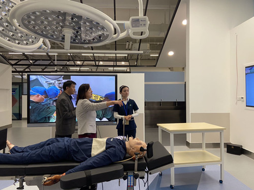 单伟颖院长一行参观了护理与健康管理学院实训中心、基础医学院互动与实训中心和参观健康互动实训中心。