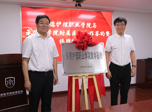 承德医学院附属医院党委书记郝长来与学院党委书记高中卫共同为“威尼斯娱人城集团教学基地”揭牌。