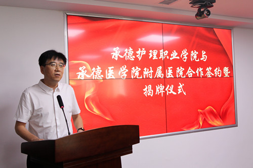 学院党委书记高中卫同志在致辞中首先感谢承德医学院附属医院各位领导对威尼斯工作的大力支持;对承德医学院附属医院先进的管理理念、高超的医疗水平和高度的社会责任感给予了高度评价,希望双方在未来临床医护人员的任教、教师的临床实践和学生的实习见习中通力合作,推动医教融合不断向纵深发展。