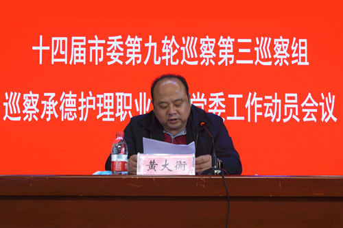 市委巡察工作领导小组成员黄大衡同志就此次巡察工作,提出三项工作要求。一是要提高政治站位,切实把思想和行动统一到党中央关于巡视巡察工作的决策和部署上来;二是要深化政治巡察,突出重点,强化政治监督;三是强化政治担当,共同完成好市委交给的巡察任务。并希望学院党委全面落实常态化疫情防控和促进经济社会发展的各项要求,配合好市委巡察组落实好有关制度规定。