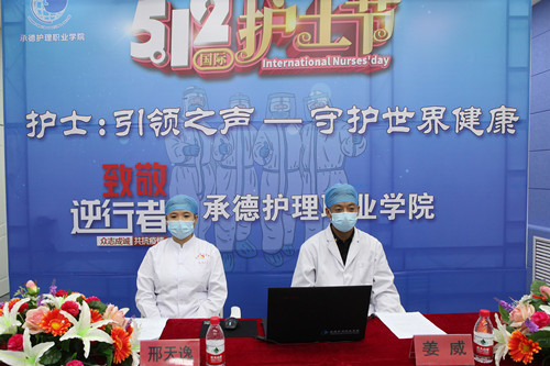 “纵情燃烧,生命闪耀;生而无畏,战之终章”。河北省第七批、承德市第三批支援武汉医疗队队员、承德市中医院重症医学科姜威护师和邢天逸护士分别介绍了在支援武汉大学中南医院、武汉市第七医院和雷神山医院42天的抗疫经历。报告中,“此生无悔赴荆楚”展现了两位援鄂护士“白衣执甲,逆行出征”的忘我精神;“用心对待,精心护理”体现了南丁格尔精神救死扶伤的传承;“来世还做中国人”表达了在以习近平同志为核心的党中央领导下,全民抗疫的中国速度、中国精神、中国力量,深切感受到的作为一名中国人的自豪感。两位援鄂护士的每一句话都深深打动了聆听报告的师生,大家纷纷通过线上提问的方式进行互动交流,现场气氛十分活跃。