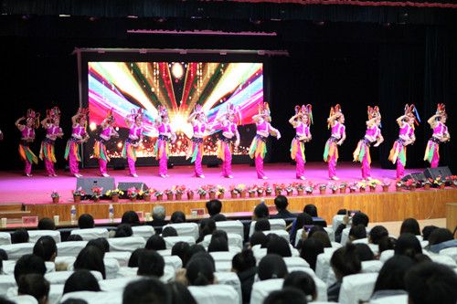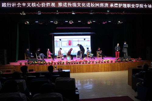 为落实中共承德市委宣传部、市旅游和文化广电局、市文艺工作者联合会关于开展“到人民中去” 文艺工作者进基层,种文化主题活动的精神,2019年11月15日,由承德市政协、承德市旅游和文化广电局、承德市教育局、承德市思想道德研究会、承德市老科技工作者协会、河北省承德话剧团等单位联合组织市直新老艺术家和优秀青年演员编排的一台“德育铸灵魂 满园文明花”主题文艺节目来到威尼斯,为师生带来一场精彩的演出。承德市政协、承德市教育局、承德市思想道德研究会、承德市老科协会等部门领导以及威尼斯党委书记毕建华、党委副书记王建军、宣传部长邢淑兰、团委书记陈荟洁等出席此次活动。400多名师生在现场观看了演出。