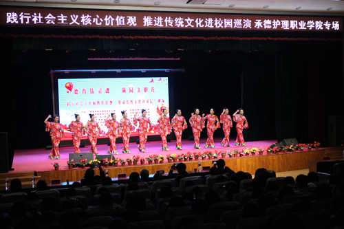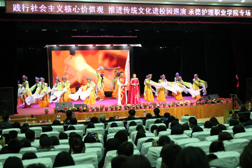 曾在2015年在省委宣传部、省文化厅等部门组织的全省舞蹈大赛中荣获总冠军称号,2017年全国精彩瞬间舞蹈大赛获得一等奖的滿族民间舞蹈《萨满欢歌》拉开发巡演的帷幕,绚丽的舞台、美妙的音乐、曼妙的舞姿为同学们带来了一场视听盛宴。原创歌曲《魅力承德 我为你喝彩》、小品《一块香蕉皮》、京剧清唱《智取威虎山》、情景剧《三袋大米》、女声表演唱《德字歌》、话剧《兄弟情深》、河北梆子《龙江颂》选段,“望北京更使我增添力量”、广播剧《让梨与让座》、歌曲《我们的祖国歌甜花香》等节目精彩纷呈,不仅展现了表演艺术家们的演出功底,更是让师生在欣赏艺术作品的同时,在母爱、励志、亲情、社会公德等故事中感受到了思想和心灵的洗礼,深受师生的喜爱。演出在歌声悠扬,舞蹈优美的戏歌舞蹈《中国脊梁》中圆满结束。