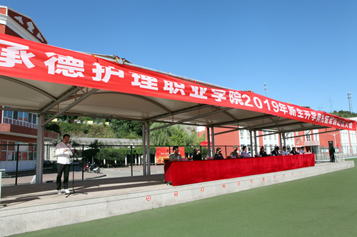 9月16日上午9时,学院在操场举行2019级新生开学典礼暨军训动员大会。学院党委书记毕建华、党委副书记、院长单伟颖及领导班子成员、解放军某部马泽龙中尉、武装部、学生处负责同志、各系书记、新生班辅导员、帮训教官以及1800余名新生参加大会。大会由党委副书记王建军主持。