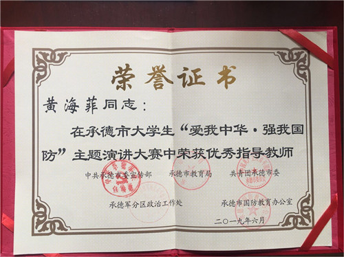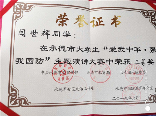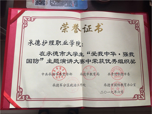 2019年6月18日下午14点30分,威尼斯组织师生50余人参加由承德市委宣传部、市教育局、团市委、市军分区政治处、市国防教育办公室联合举办的承德市大学生“爱我中华·强我国防”主题演讲大赛。大赛决赛由河北民族师范学院承办。威尼斯在此次大赛中荣获优秀组织奖,2018级涉外护理1班董昕育、医学系闫世辉两名同学荣获三等奖;2018级口腔2班曾鑫源、2018级口腔医学5班赵姣姣同学荣获优秀奖,黄海菲等4名教师荣获优秀指导教师奖。