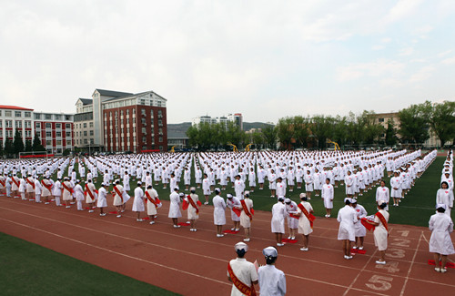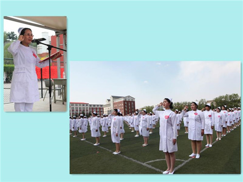 随后,在优美的音乐声中,来宾和学院从事护理教育的老师们亲自为即将走向实习岗位的1703名护理专业学生戴上燕帽。承德市妇幼保健院护理部主任金宝玲女士带领全体护生们集体宣誓,南丁格尔誓言响彻校园。