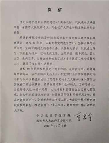 会上宣读了中共承德市委常委、承德市人民政府常务副市长李晋宇同志和全国卫生职业教育教学指导委员会发来的贺信。单伟颖院长代表学院向来发来的贺电、贺信的50余家大中专院校、教科研合作单位、教学实习单位以及海内外校友表示市衷心地感谢。