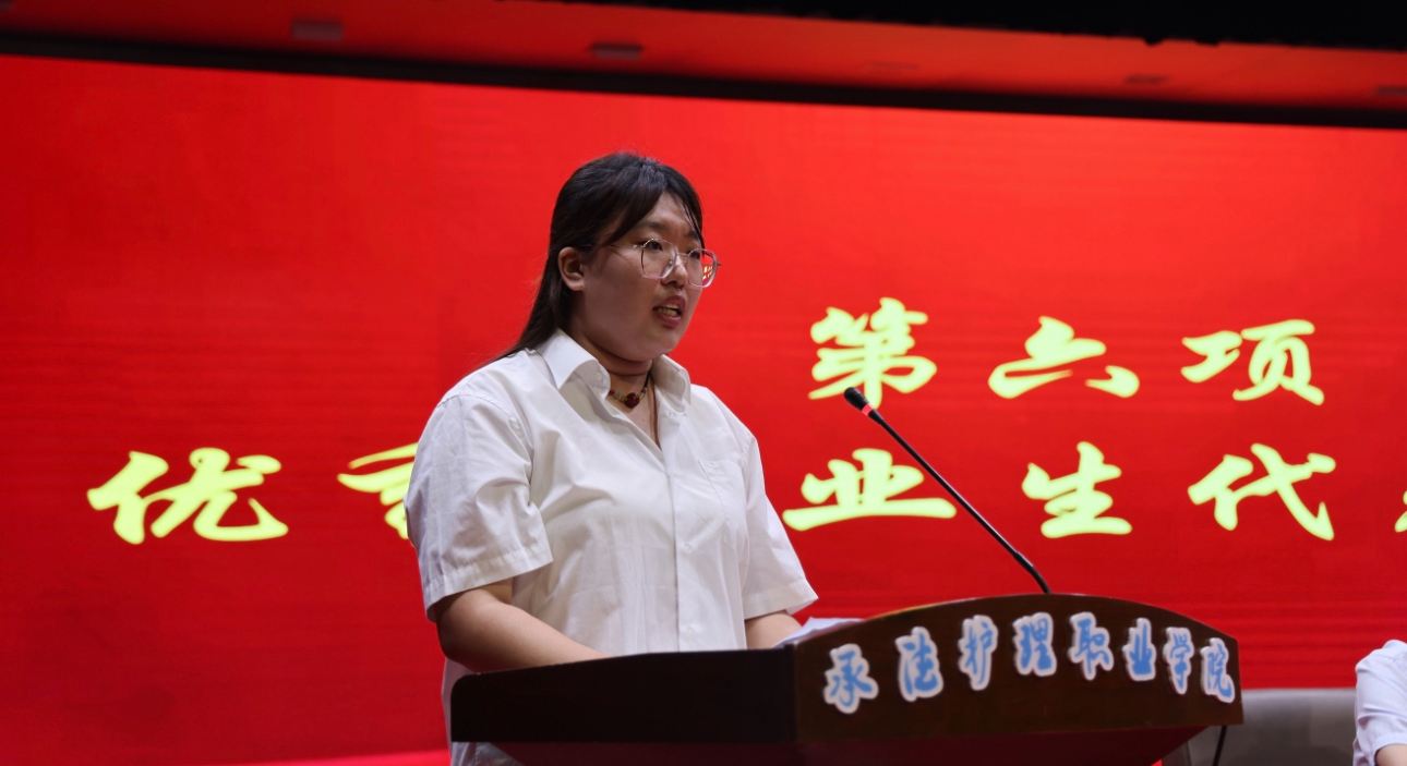 涉外护理系2023级涉外护理11班刘佳桐同学代表在校生发言。表示将以优秀毕业生为榜样,刻苦学习,锐意进取,无私奉献,努力提升自己的综合素质和实践能力,以更饱满的热情、更坚定的信念迎接未来的挑战与机遇。
